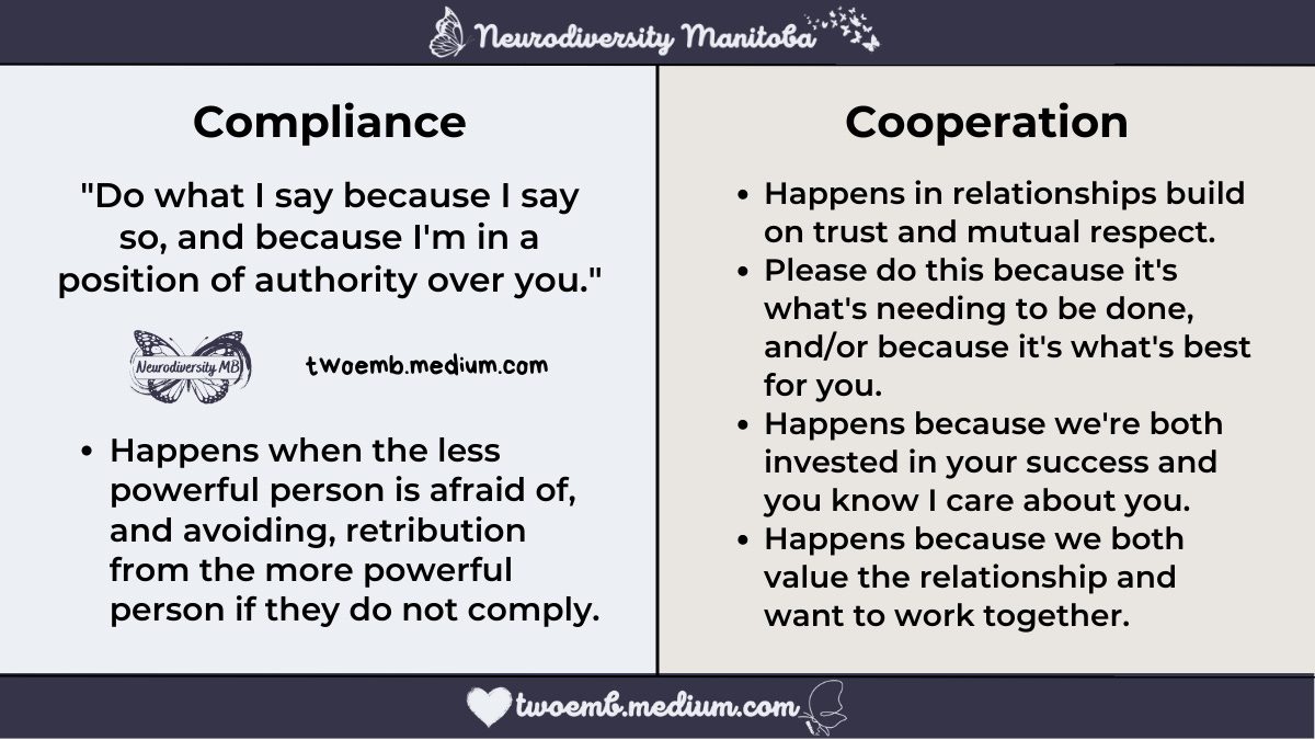 “Cooperation involves meeting the needs of both individuals, whereas compliance is typically fear-based and is focused on the needs and desires of the more powerful person.” — Robyn Gobbel